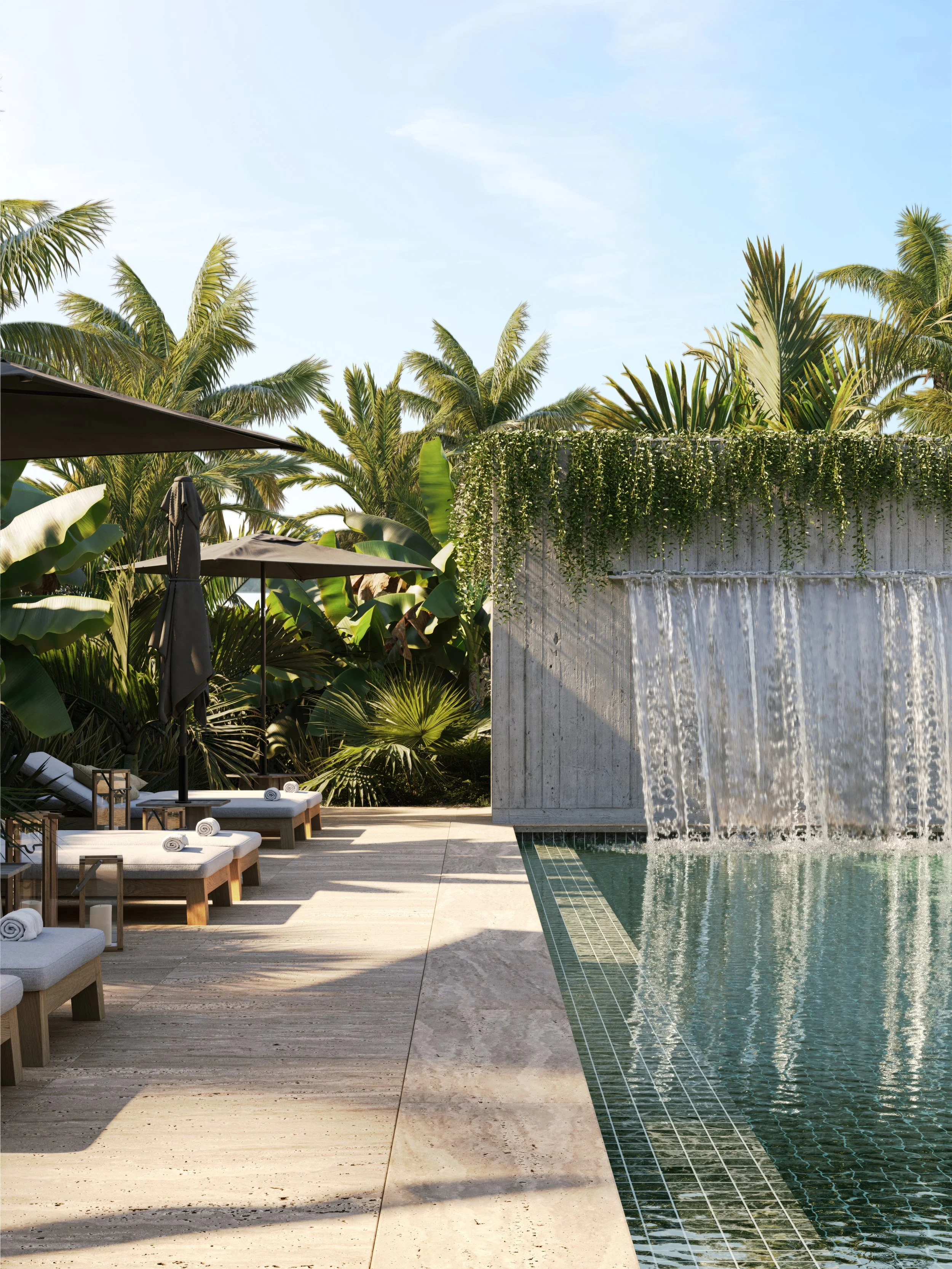 Porters Palms’ architecture was envisioned as a testament to the subtle beauty found in the interplay of textures, simplicity, and materiality. From stone to natural wood, each element was carefully selected to evoke a sense of understated elegance. Throughout the project, sophisticated simplicity stands as the guiding ethos, inviting the residents to embrace a lifestyle defined by thoughtful design and aesthetic sensibility.